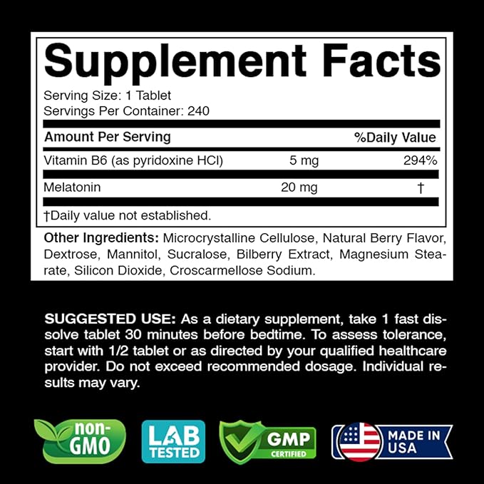 Melatonin 20 mg - 240 Fast Dissolve Tablets - Drug Free - Natural Berry Flavor - Vegetarian, Non-GMO, Gluten Free 240 Count (Pack of 2)