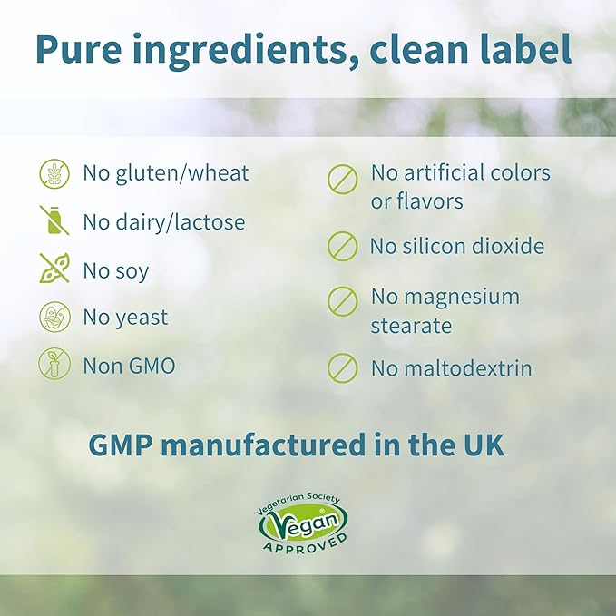 - PURE & CLEAN - formulated by nutrition scientists; we only use hypoallergenic ingredients with no unnecessary additives (such as silicon dioxide or magnesium stearate), lab verified, vegan, GMP manufactured in the UK