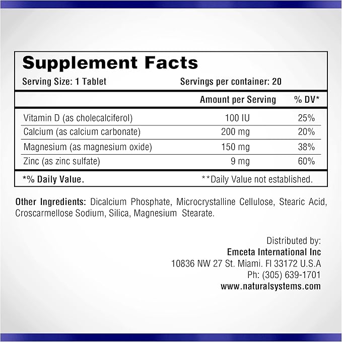 - [100% SATISFACTION GUARANTEED] Natural Systems Cal-mag-zinc Plus Vitamin D tablets are made with quality standards in order to provide a great supplement for the daily diet.