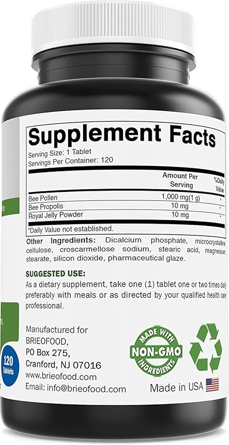 Brieofood Bee Pollen Complex 1000 mg 120 Tablets - Made with Bee Pollen, Bee Propolis, & Royal Jelly Powder