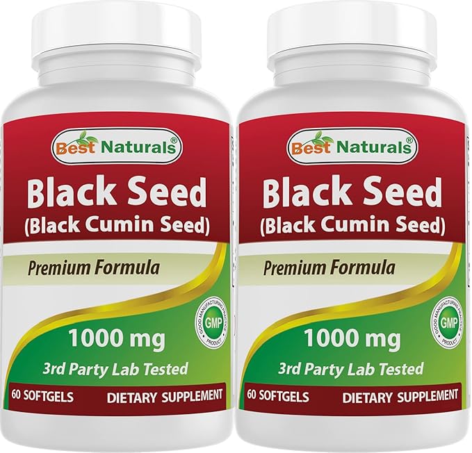 Best Naturals 2 Packs Black Seed Oil Capsules 1000 mg (Non-GMO) Nigella Sativa - 100% Cold Pressed Black Cumin Seed Oil Pills Contains Thymoquinonoe 60 Count (Total 120 Softgels)