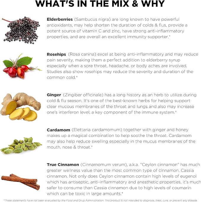 - Comes with a Free Reuseable Brew Bag, Just Add Honey: Organic elderberry dried combines with ginger, rosehips, cardamom, and Ceylon cinnamon to make a delicious and potent elderberry syrup organic. Just add raw, local honey!