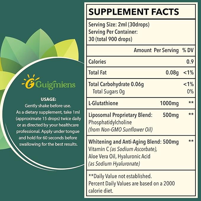 - Superior Antioxidant Formulas 2000 mg - Most of the liposomal glutathione on the market are very simple and low doses. But Guigmiens Complex Liposomal Glutathione Liquid has premium exclusive formulas, a total of 2000 mg, contains 1000 mg liposomal reduced glutathione, Liposomal Proprietary Blend 500 mg, Aging Defense Blend 500 mg(Vitamin C) to support the liver, brain, skin health, immune system.