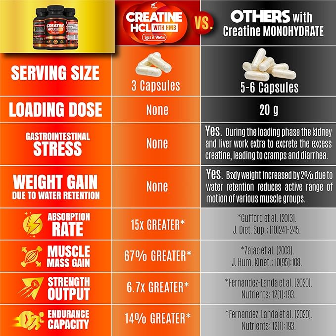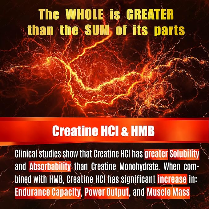 - THE WHOLE IS GREATER THAN THE SUM OF ITS PARTS: Studies show that Creatine HCl taken together with HMB have synergistic effects: together they increase Muscle Gains and Power Output by 67% and 6.7x greater than Creatine Monohydrate alone, respectively; furthermore, they also prolong the Endurance Capacity by 14% compared to the sum of each alone.