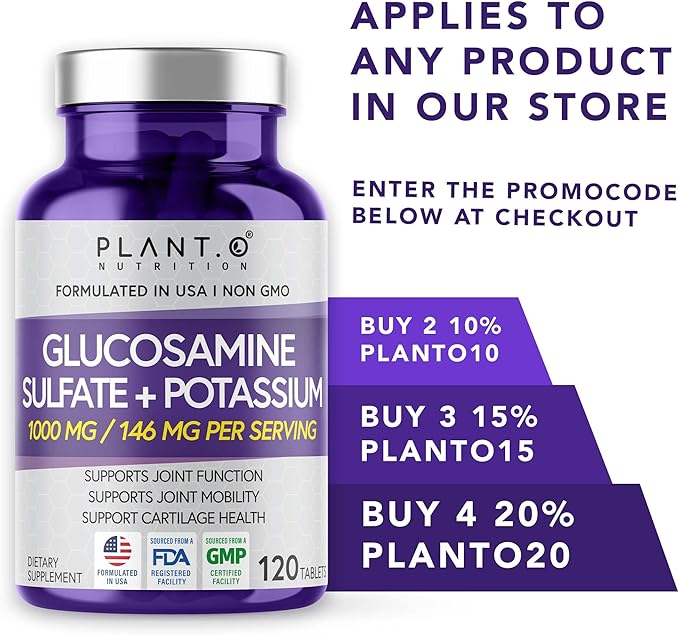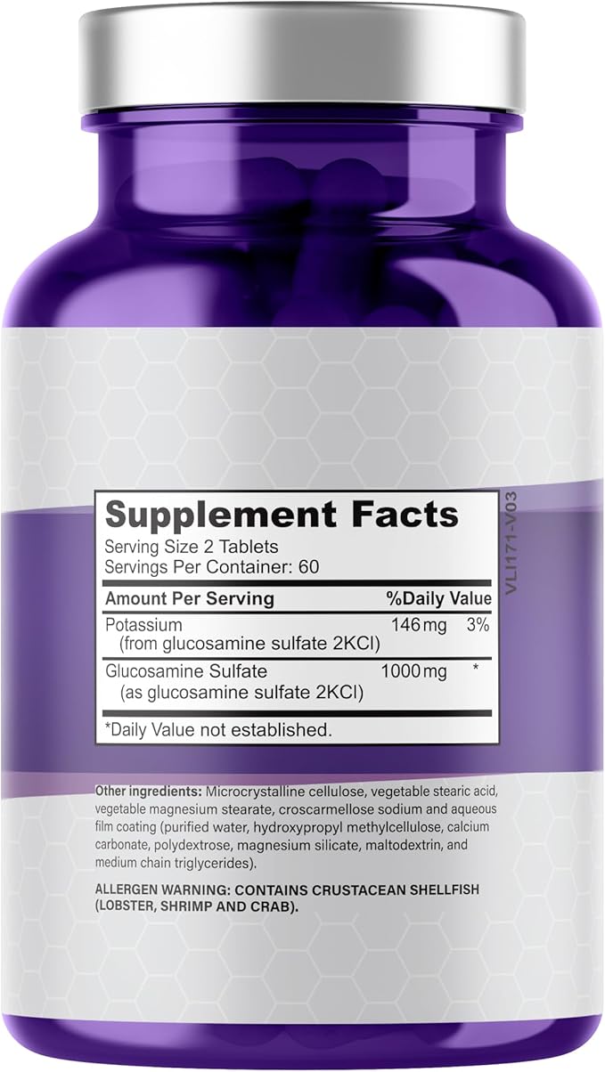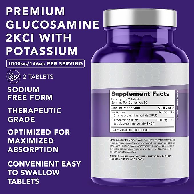 - POWERFUL GLUCOSAMINE SULFATE 2KCI FOR JOINT DISCOMFORT. Get better results with our joint support supplement and enjoy an active life free from joint stiffness! Our bone and joint vitamins contain glucosamine sulfate 1000mg per serving and potassium for enhanced absorption and better bioavailability.