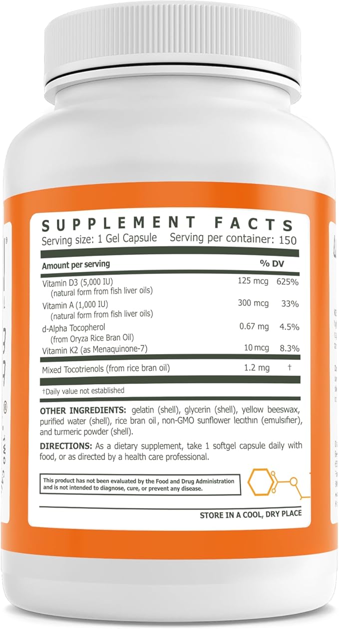 - 150 Softgel Servings - This Vit d3+k2 supplement comes in a bottle of 150 softgels, each containing Vitamin D3, A and K2. Our supplements do not contain: MSG, gluten, corn, starch, sugar, wax, zein, sulfate, phosphates, (other than coenzymes), preservatives, casein or other milk derivatives. GMO free.