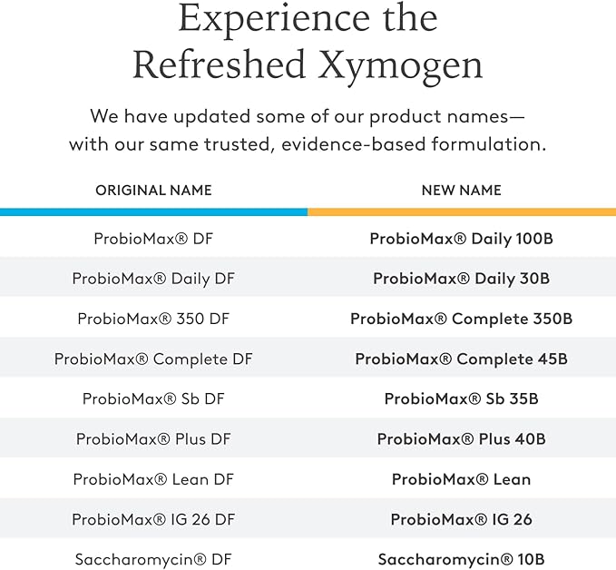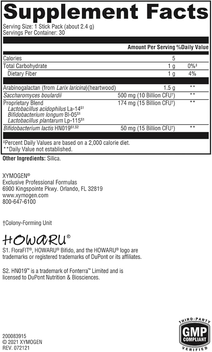 - Contains lactobacillus and bifidobacterium strains. Formulated to Exclude: Wheat, gluten, soy, animal and dairy products, fish, shellfish, peanuts, tree nuts, egg, ingredients derived from GMOs, and artificial preservatives. XYMOGEN probiotic nutritional supplements are practitioner trusted.