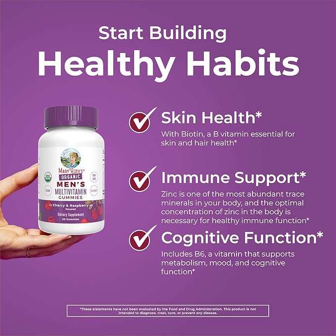 - Organic Men's Multivitamin Gummies: USDA Organic Gummies Formulated to Support Men’s Health! Support your skin | immune system | and cognitive function with these cherry & raspberry-flavored gummies.