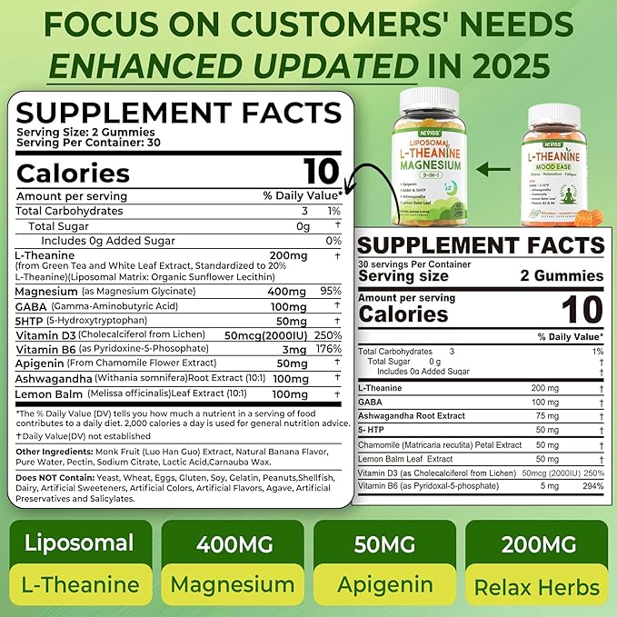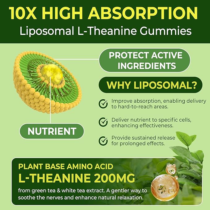 - 【Liposomal L-Theanine Magnesium Gummies – Better Absorption, Calmer You 】Experience the calming power of liposomal l-theanine gummies, designed for superior absorption and faster effects. Unlike standard chewables, our liposomal delivery system protects L-theanine through digestion and helps it reach your system more effectively—so you feel the relaxing benefits sooner and more completely. Delicious, fast-acting, and easy to enjoy anytime calm is needed.