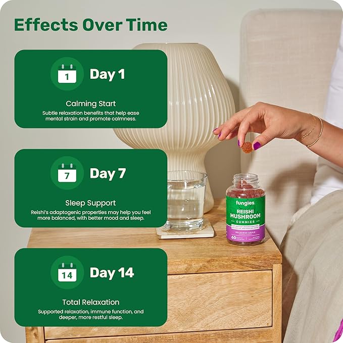 - Unlock Your Serenity: Unwind with Fungies Reishi Mushroom Calm Gummies, the sweetest way to help your mind and body relax! Packed with soothing Reishi mushroom goodness, these apple-flavored mushroom gummies are the ultimate wellness treat for a serene life. Includes 60 gummies for a 2-month supply.