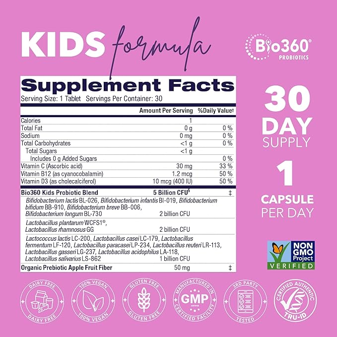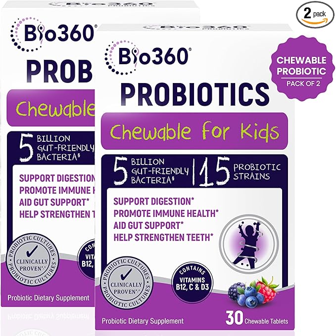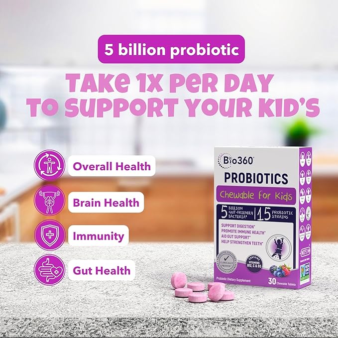 - TRUSTED BY MOMS: Each chewable probiotic is individually sealed in a shelf stable blister pack for protection. Bio360 Supplements are Natural, Non-GMO Project Verified, Vegan friendly & Free of Dairy, Gluten, Egg, Peanut & Soy.