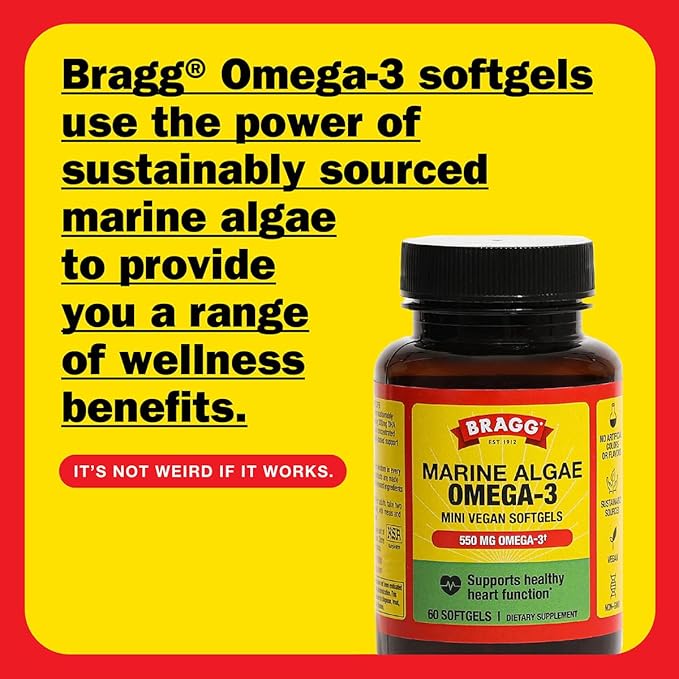 - BRAGG SUPPLEMENT CAPSULES: Bragg Omega-3 softgels use the power of sustainably-sourced marine algae to provide a range of wellness benefits; Provides 300mg DHA and 150mg EPA per serving, aligning with recommendations for daily Omega-3 intake.