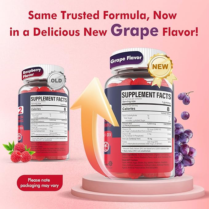 - MADE IN THE USA, QUALITY GUARANTEED: Our iron b-12 vitamin gummies are made in the USA with high-quality, natural ingredients—including plant-based Vitamin D3 from wild lichen. Vegan with a delicious raspberry flavor. Non-GMO, gluten-free, dairy-free, and manufactured in GMP-certified facilities with third-party testing to ensure purity, potency, and effectiveness. Just one gummy a day delivers key nutrients—2 months per bottle, 4 months with two bottles, all at a better value than others.