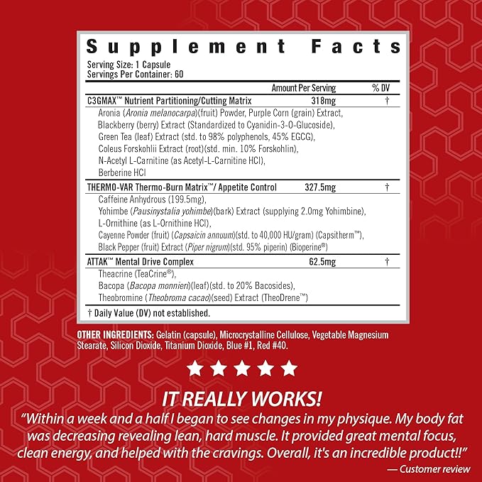 - Sustained Energy: LIPO-DREX delivers sustained and smooth energy via the THERMO-VAR Thermo-Burn Matrix with ingredients like caffeine and Yohimbe. This works in combination with the ATTAK Mental Drive Complex that includes industry-leading ingredients like TeaCrine and Theobromine to give you an energetic, high-focus feeling.