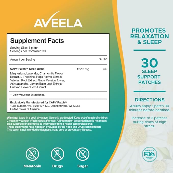 - SIGNATURE RELAX BLEND – Capy Patch’s formula provides a unique mix of sleep supporting ingredients directly to the bloodstream. Melatonin free Capy Patches are specially designed for individuals with melatonin allergies and are 21% stronger than our regular sleep patches. Our signature blend of chamomile, lavender, L-theanine, hops, valerian, magnesium, 5-HTP, gaba, passionflower, skullcap and B6 naturally and effectively supports sleep.