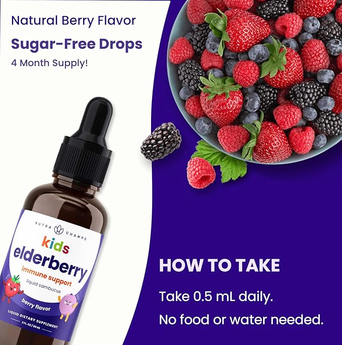 NutraChamps Black Elderberry for Kids Liquid Drops, 10:1 Extract Sambucus Elderberry Syrup for Kids, Sugar-Free European Elderberry Drops Berry Flavor, Immune Support, 4 Month Supply