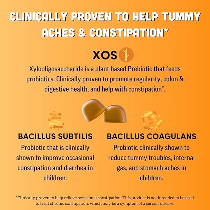 - CLINICALLY-BACKED VITAMINS FOR KIDS: Our kids probiotic + prebiotic supplement features clinically-backed ingredients shown to support a healthy gut. We use 2 Billion CFU of Research Backed Probiotics and 1,000mg of Organic XOS Prebiotic to support tummy discomfort, reduce bloating, and promote overall gut health.