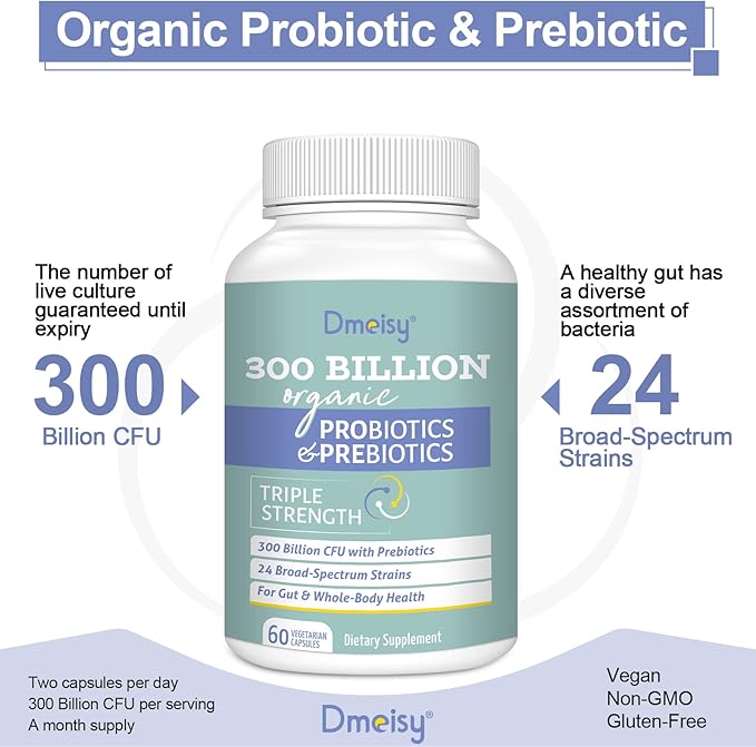 - 300 Billion CFU from 24 Broad: Spectrum Probiotics: A healthy gut has a diverse assortment of organisms. So should your probiotic. Dmeisy triple strength probiotic supplement delivers 300 billion active cultures from 24 broad-spectrum probiotic strains from lactobacillus and bifidobacteria blend which good for skin, digestive & gut health