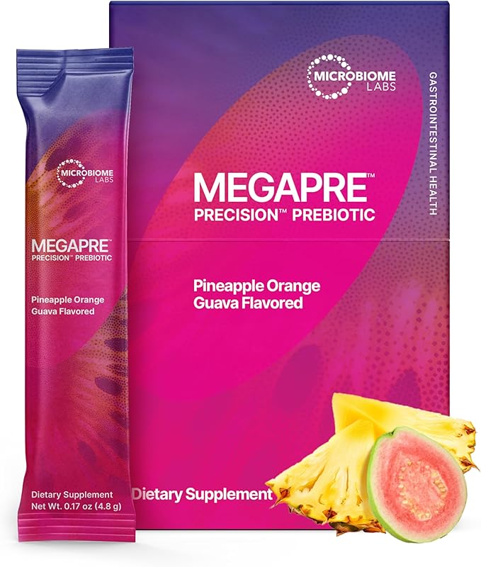 Microbiome Labs MegaPre Prebiotic Fiber Powder for Women, Men & Kids - Pre-Dosed Prebiotic Fiber Supplement Powder with Clinically Tested Oligosaccharides - Pineapple Orange Guava (30 Drink Packets)