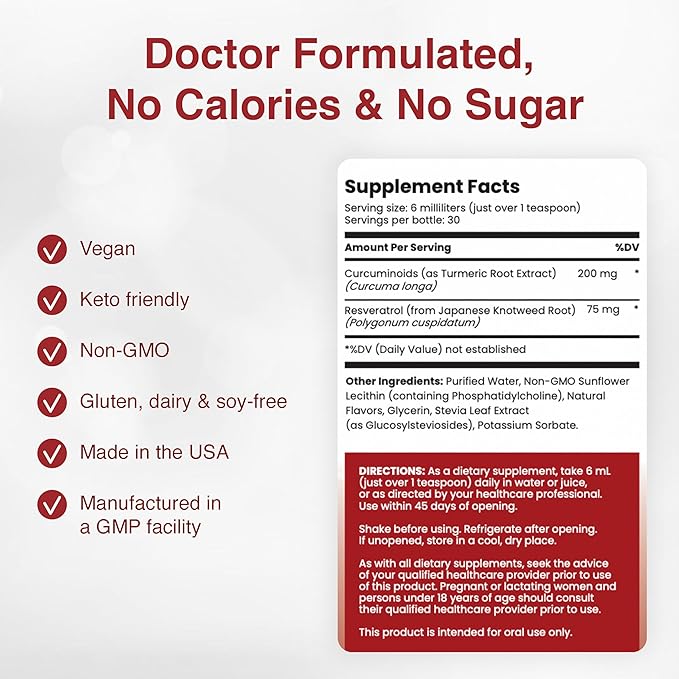 - DOCTOR FORMULATED: Potent Liquid Liposomal Turmeric Curcumin and Resveratrol supplement has 10x higher absorption rate and superior bioavailability. This potent Turmeric supplement delivers 200mg of Curcuminoids and 75mg of Resveratrol in one daily liquid serving. Includes 30 servings per bottle.