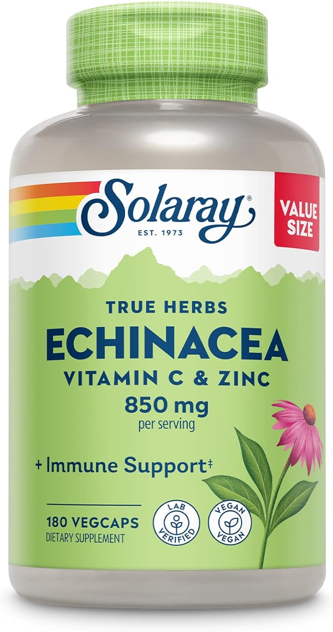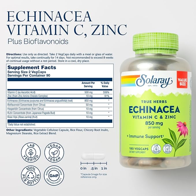 SOLARAY Echinacea Vitamin C & Zinc 850mg Plus Bioflavonoids, Echinacea Capsules for Healthy Immune Support, Vegan, Lab Verified, 60-Day Money-Back Guarantee, 90 Servings, 180 VegCaps
