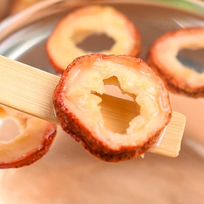 - Premium Material & Origin: Select high-quality hawthorn, naturally cored, sliced ,and dried. In this way, the preservation time of the hawthorn becomes longer, and at the same time, our hawthorn is hollow and round, without a stem, which is very convenient to eat directly. The skin is bright red, the flesh is light yellow.