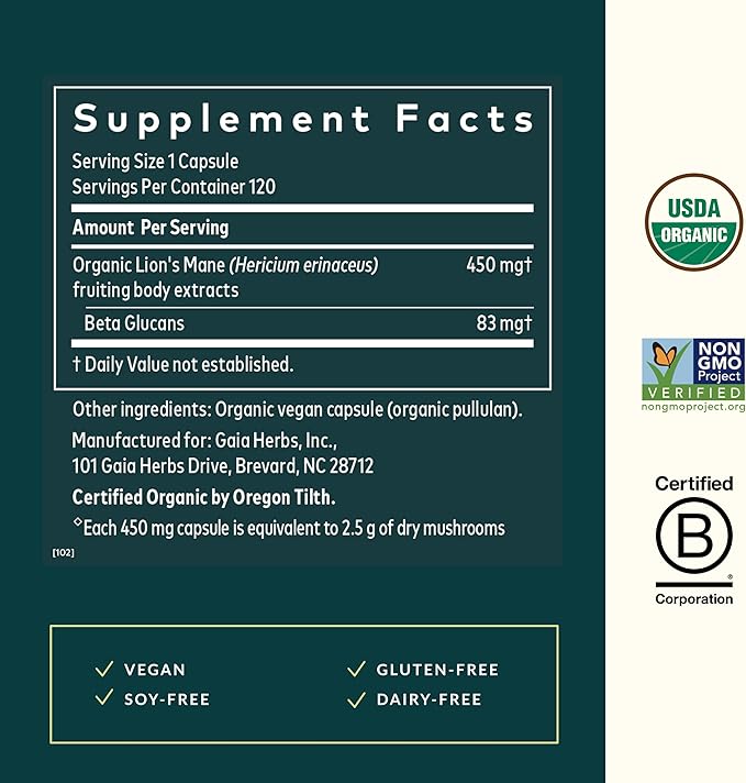 - Purity-Tested: Gaia Herbs Lion's Mane Mushroom is vegan, gluten-free & proudly made in NC, USA