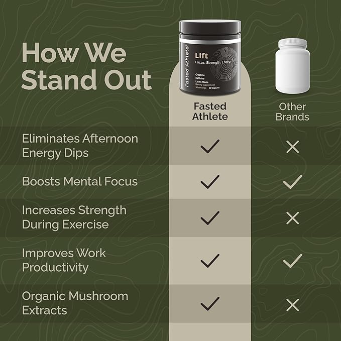 - LIONS MANE SUPPLEMENT CAPSULES - Introducing Lift by Fasted Athlete, a cutting-edge lion's mane supplement crafted to elevate both mental acuity and physical performance. Formulated to enhance clean-energy production at the cellular level, Lift facilitates the generation of ATP, the body's energy currency, fostering unparalleled focus and sustained energy all-day, free from the dreaded afternoon crash or jitters.