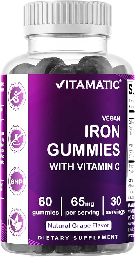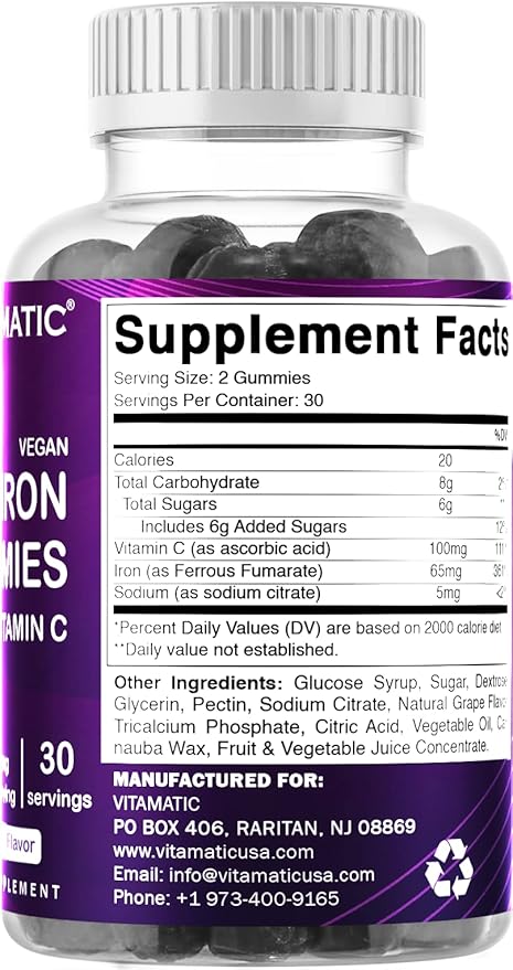 - DELICIOUS NATURAL GRAPE FLAVOR TASTE of Vitamatic Iron Gummies - Avoid consuming large Iron Capsules, Tablets or Pills which gives unpleasant after taste & can not go down easily