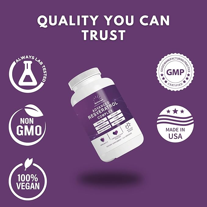 - POWERFUL INGREDIENTS: Nutriumph Advanced Resveratrol Complex is made with Japanese Knotweed, Green Tea Leaf extract, Acai fruit extract, Olive Leaf, Grape Seed extract, Alpha Lipoic Acid, CoQ10 and L Glutathione for a powerful blend that will protect your cells from oxidative damage. Each bottle contains 120 vegan capsules (60-day supply) and delivers 1400mg of potent antioxidants in each serving.