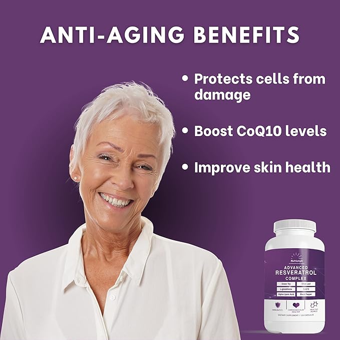 - ANTI-AGING BENEFITS: Resveratrol, Green Tea, Olive Leaves, L-Glutathione and CoQ10 have antioxidant properties that protect cells from damage caused by free radicals. As we age, our levels of CoQ10 decline, which may contribute to age-related health problems. Supplementing with CoQ10 and other powerful antioxidants may help slow down the aging process and improve overall health.