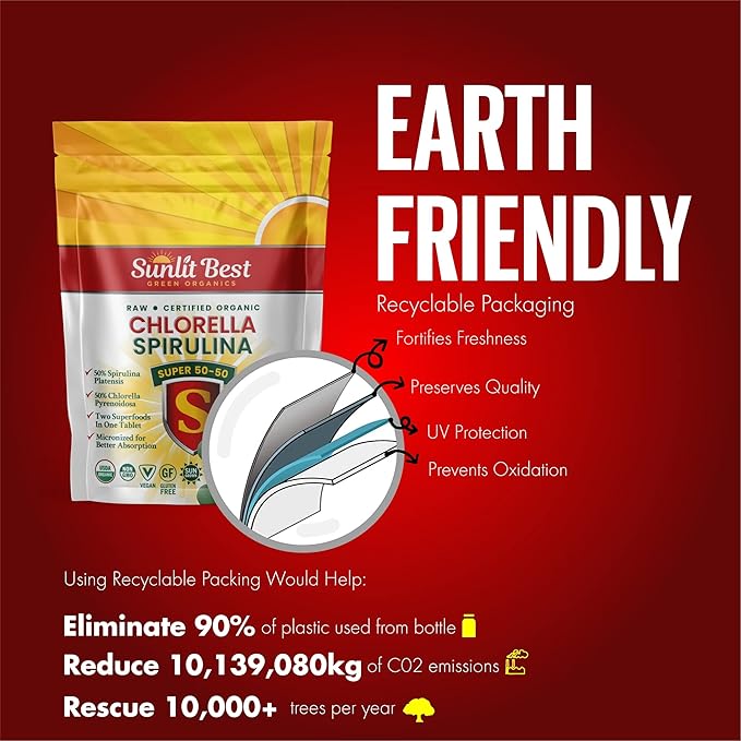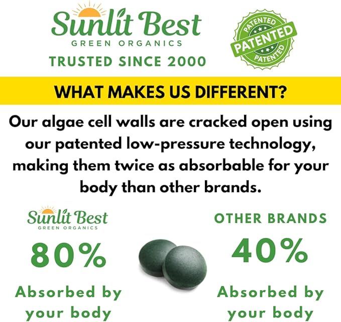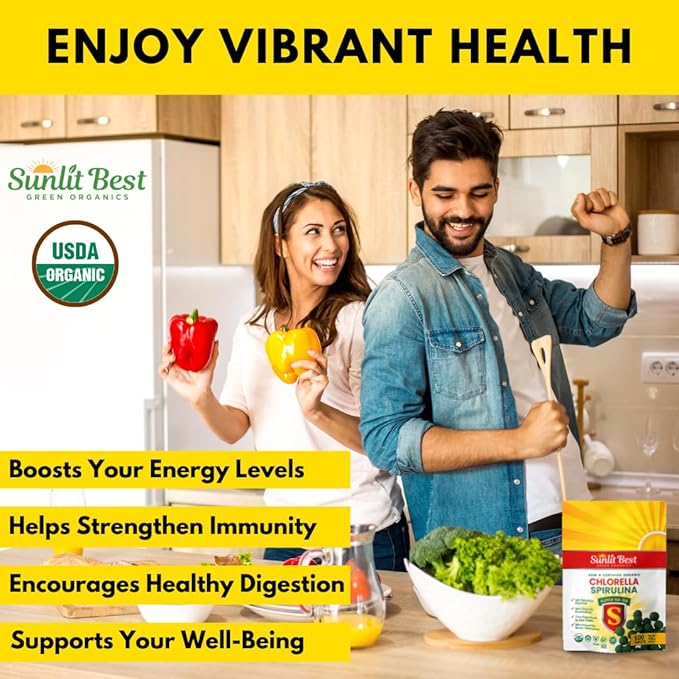 - Nourishes Your Body For Optimal Health: Our Organic Chlorella Spirulina Super 50/50 superfood greens supplements (50% Chlorella & 50% Spirulina) nourish your cells to help boost energy levels, support a strong immune system, nourish your body, cell damage, and help digestion and gut health. Sunlit Best Organic Burst Chlorella Spirulina tablets are an integral part of your body cleanse, natural beauty regime & overall vibrant lifestyle.