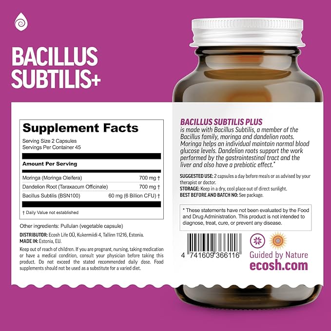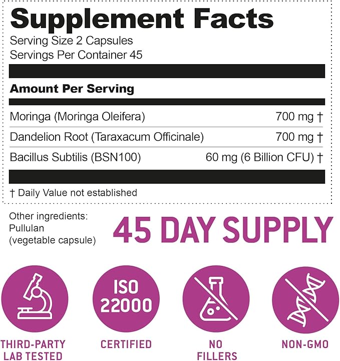 - WITH PREBIOTICS — Moringa and dandelion root are nutrient-rich prebiotics (fiber) that feed good bacilli (probiotics). Together with Bacillus Subtilis, they make a synergistic blend that supports the efficient functioning of the digestive system.