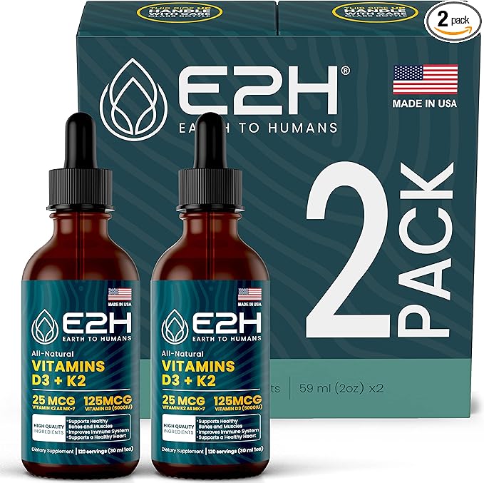 E2H EARTH TO HUMANS Vitamin D3 & K2 Supplement for Immune Support - Liquid Vitamin D3 5000 IU - Made in The USA | Non-GMO, Vegan - (2 Bottles)