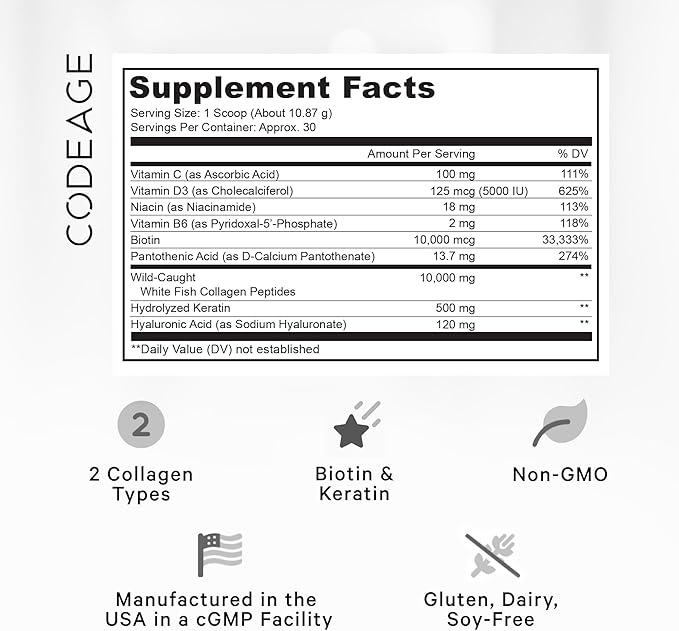 Codeage Marine Collagen Protein Powder Supplement Platinum - Biotin 10,000 mcg, Vitamin C, D3 & B6, Keratin, Hyaluronic Acid, Niacin, Wild Caught Hydrolyzed Fish Collagen Peptides - Non-GMO - 11.50 oz