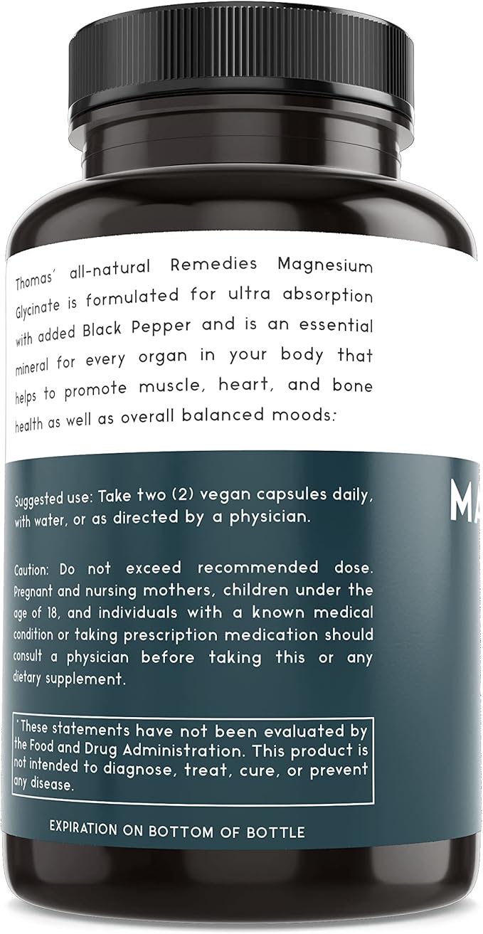 Thomas' all-natural Remedies Magnesium Glycinate Supplements, High Absorption, Dietary Supplements for Muscle and Bone Support, Non-GMO, No Fillers, 60 Vegan Capsules