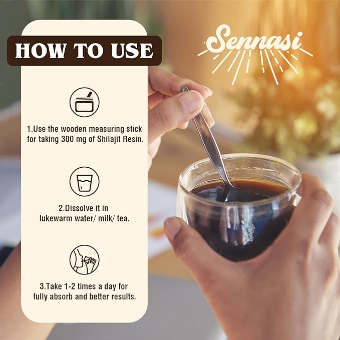 - Get the power of shilajit! Sennasi shilajit resin is your unique 85+ trace minerals and fulvic acid powerful source, providing you with the essential minerals your body needs to stay energized. Simply dissolve a pea-size shilajit resin in warm water or add it to your favorite drink and you will take control of your overall wellness with shilajit