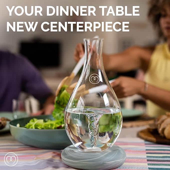 - The Perfect Gift: Mayu Swirl Dispenser comes in a beautiful box that includes: Glass Carafe, stainless steel lid+ Vortex generator base, with a rechargeable li-ion battery+ USB Type C tip charger| Power: 5V- 1A