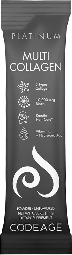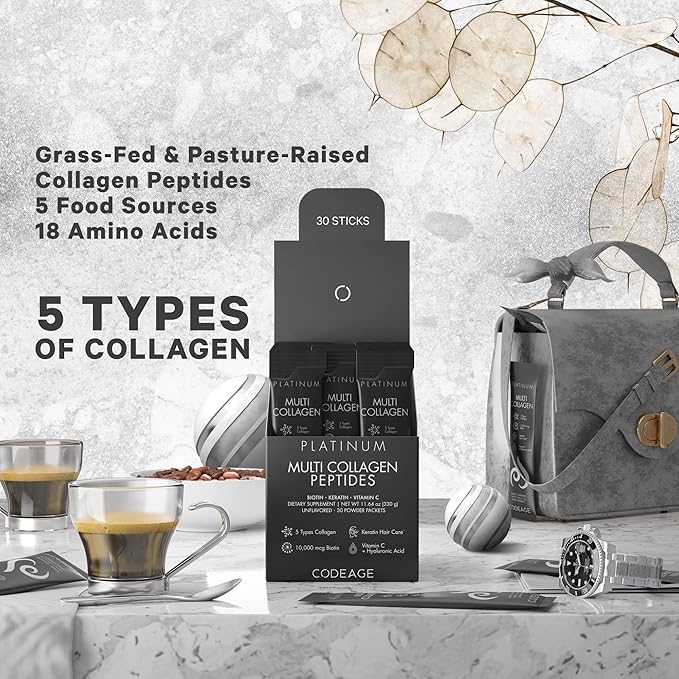 - Premium Multi Collagen Blend: Codeage Multi Collagen Peptides Platinum Stick Packs supplement features a unique combination of 5 types of collagen peptides sourced from five different food sources, providing a comprehensive profile of 18 amino acids in one convenient stick pack.