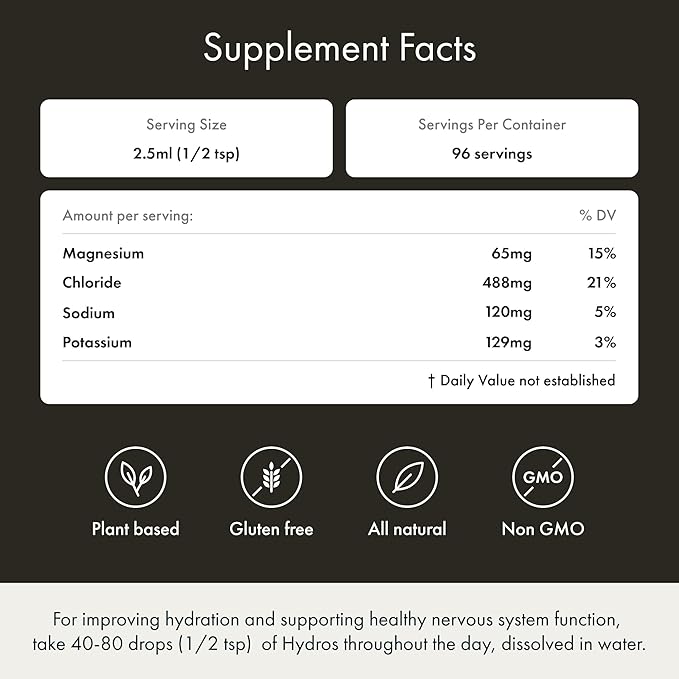 - Supports a Stronger Nervous System - Mix Hydros trace mineral drops with filtered or distilled water to turn it into mineral-rich water. Hydros supplies your nervous system with the essential trace minerals electrolytes that help it thrive.