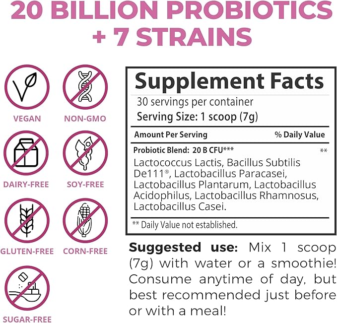 - ππππ ππ πππ πππ ππππππππππβ Each serving of Teami prebiotics and probiotics powder contains a blend of seven different strains with 20 billion probiotics to enhance healthy gut bacteria, aid in bowel function, and promote gut healing