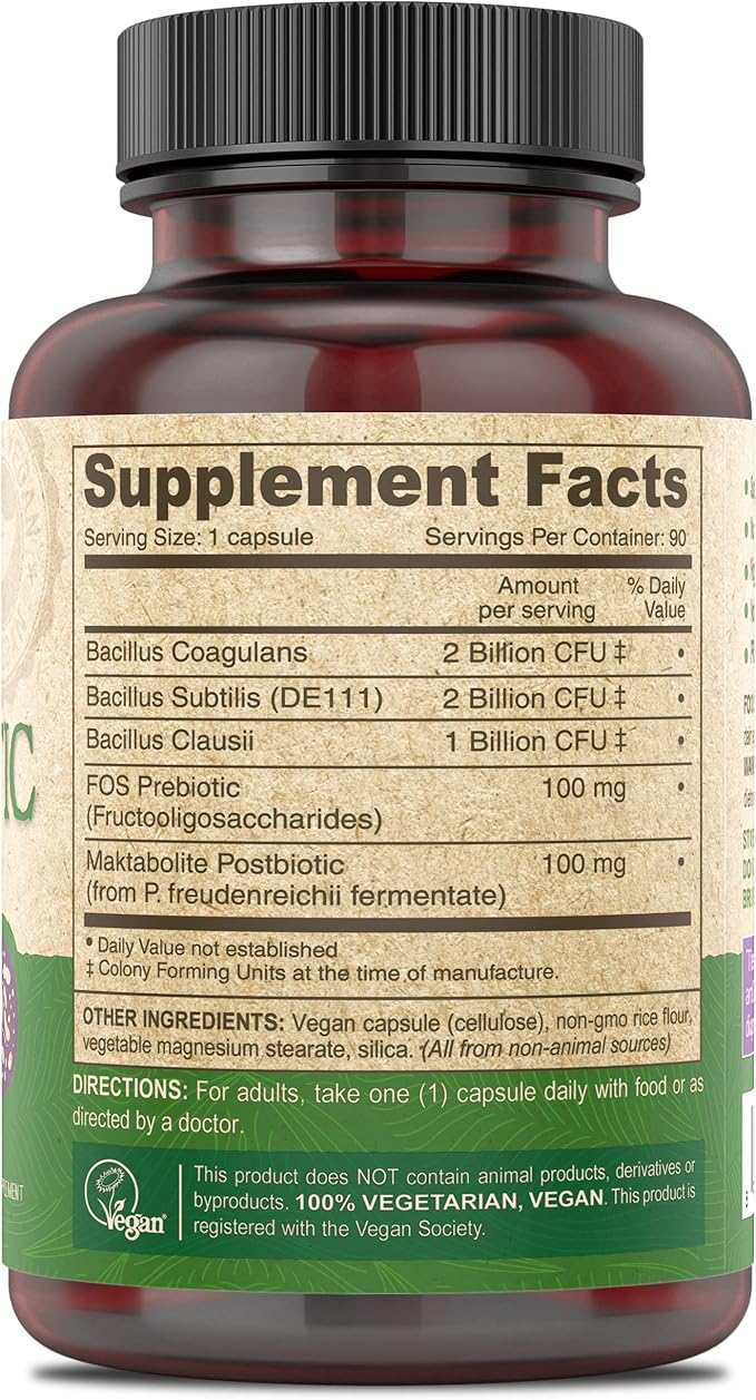 - UNIQUE 3-in-1 FORMULA: Our capsules contain a novel PRE+PRO+POST Biotic formula with a total of 5 Billion CFU in three different acid and heat-resistant probiotic strains: Bacillus coagulans, Bacillus subtilis, and Bacillus clausii. Soil-based, spore-forming, colonizing probiotic strains.