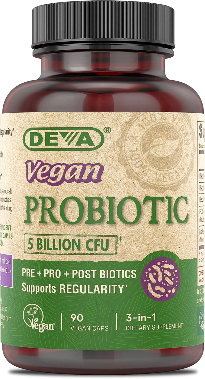 DEVA Vegan Probiotic Supplement - Pre, Pro, and Postbiotics for Digestive Health, 5 Billion CFU, Soil-Based, Spore-Forming, Dairy Free, FOS Prebiotics, for Women and Men, Vegan Capsules, 90 Count
