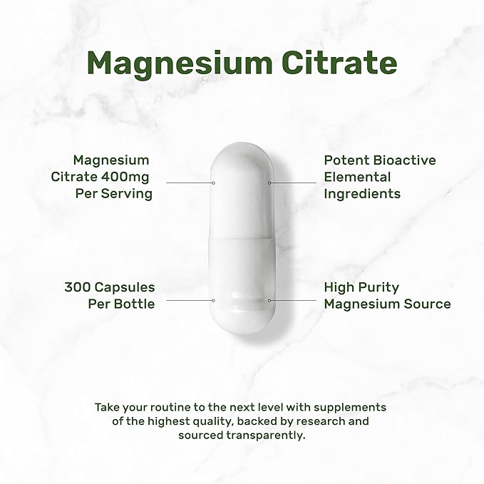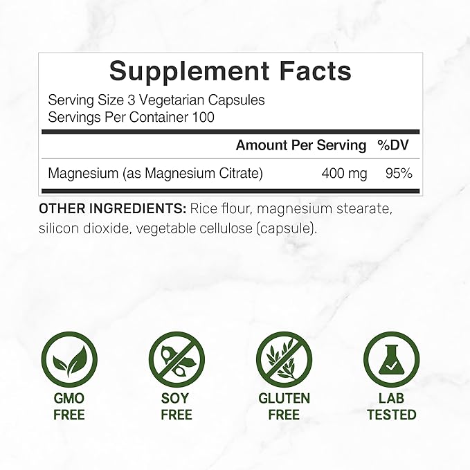 - Dosage & Servings – 3 vegetarian capsules per serving to receive 400mg of pure magnesium citrate. Each bottle offers 300 veg capsules and over a 3-month supply.