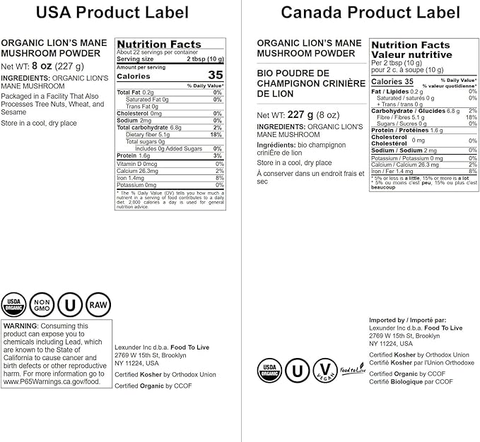 - ✔️ ORGANIC & NON-GMO: Lion’s Mane Mushroom Powder by Food to Live is Organic and Non-GMO. It is raw and suitable for a vegan diet. Moreover, it is free of trans-fat, sodium, and cholesterol.