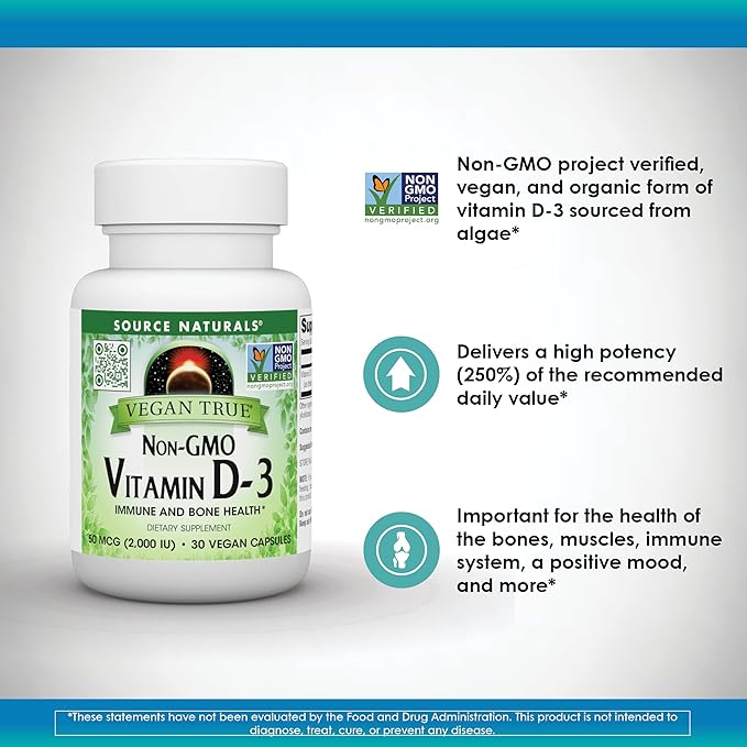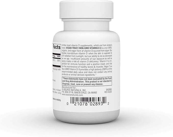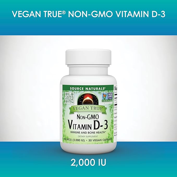 - Source Naturals Vegan True Non-GMO Vitamin D-3 is a Non-GMO project verified, vegan, and organic form of vitamin D-3 sourced from algae.