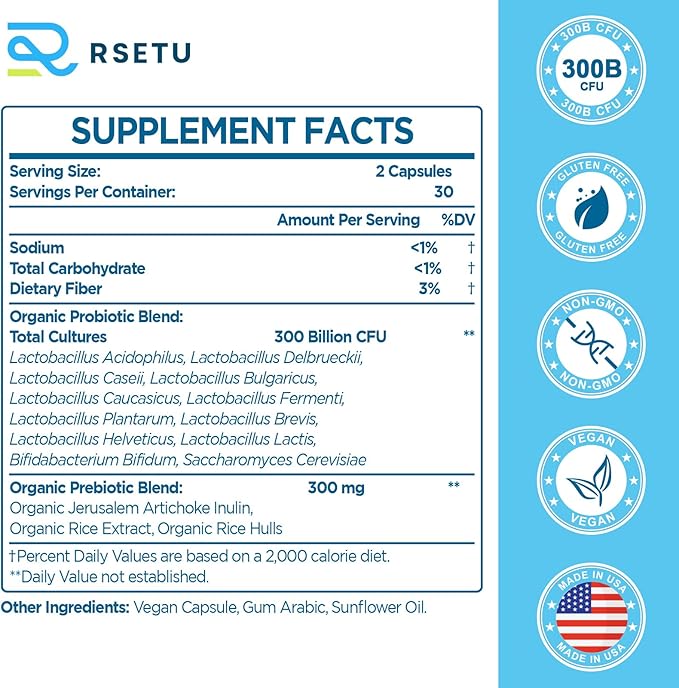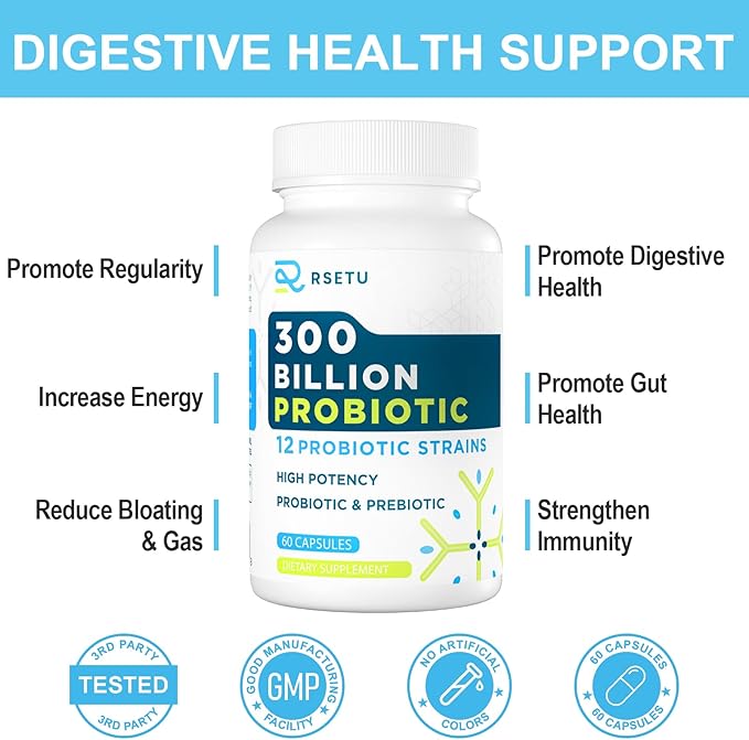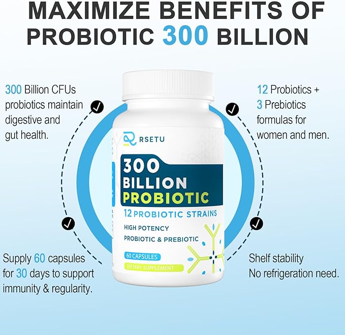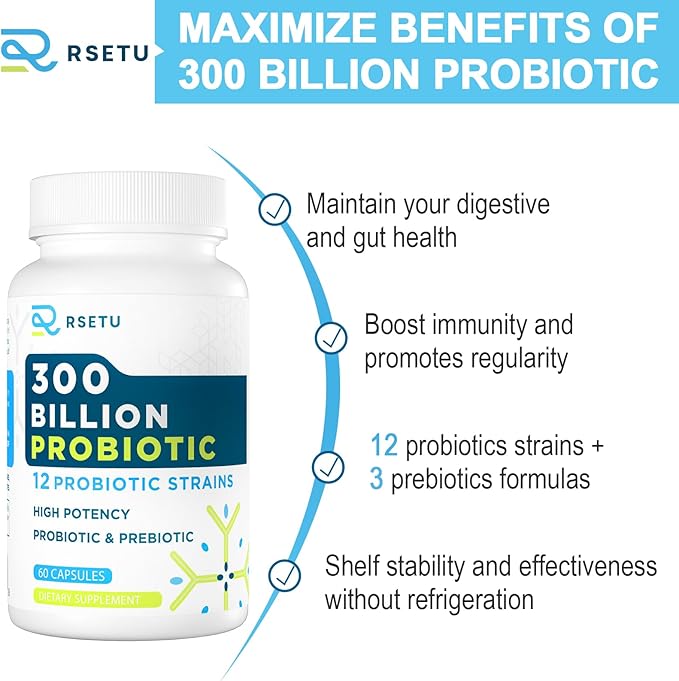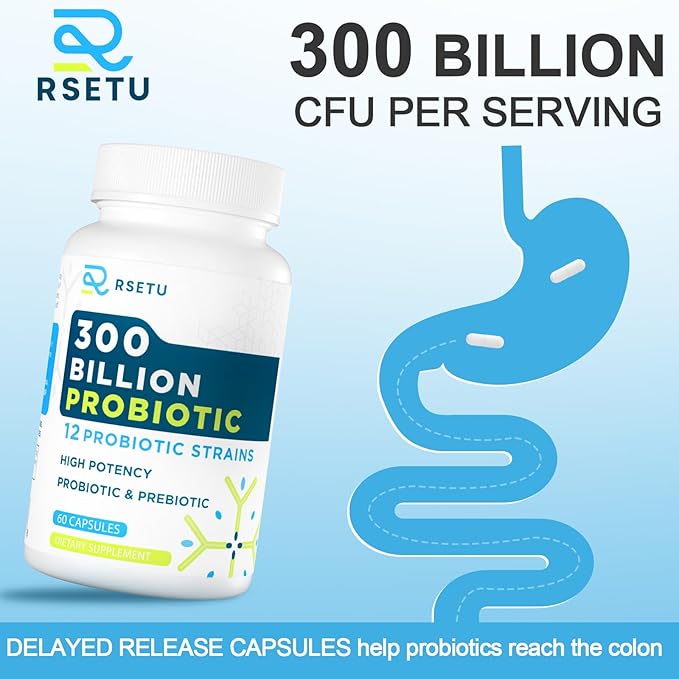 - ACTIVE PROBIOTIC - RSETU's digestive probiotics are supported by science and technology, each containing 300 billion living probiotics. Advanced delayed-release capsule technology is used to ensure that live probiotic and prebiotic strains survive in gastric acid and reach the colon. The refrigerated bottle provides a stable shelf life without refrigeration.
