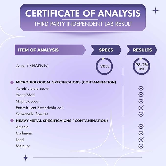 - ๐๐ถ๐ด๐ต-๐ฃ๐๐ฟ๐ถ๐๐, ๐๐ ๐ฃ-๐๐ฒ๐ฟ๐๐ถ๐ณ๐ถ๐ฒ๐ฑ ๐๐ผ๐ฟ๐บ๐๐น๐ฎ: Our Apigenin supplement is crafted with 98% purity in a GMP certified facility. We use non-GMO ingredients, ensuring a safe, high-quality product that you can trust. Designed to meet strict standards for momentous maximum potency and efficacy.
