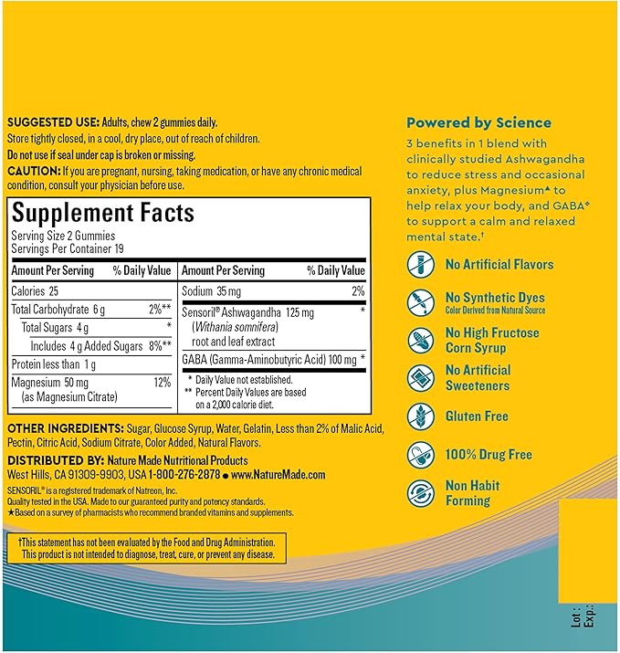 - SCIENCE-BACKED SOLUTIONS YOU CAN TRUST: This Ashwagandha, GABA & Magnesium supplement is blended by Nature Made, powered by science(1)