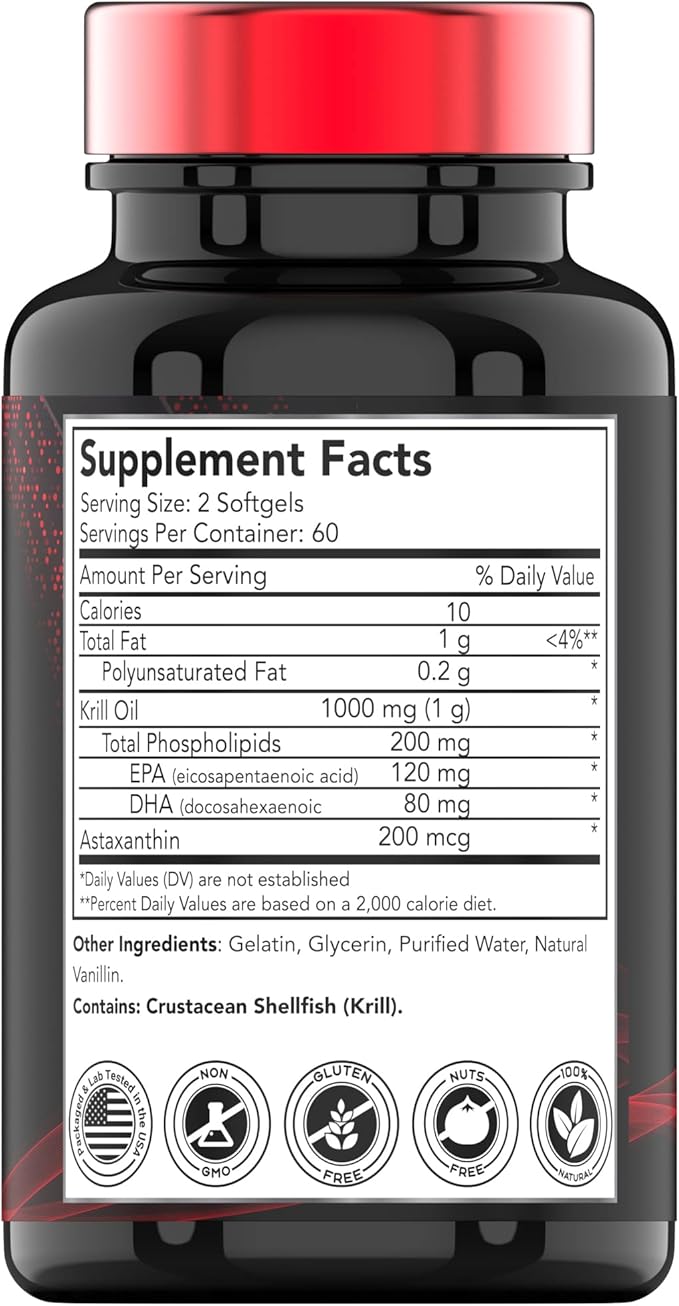- ✔️ Ultra-High Potency Formula Contains 200 mg of Phospholipids and Omega-3 Essential Fatty Acids: 120 mg of EPA, 80 mg of DHA, and 200 mcg of Astaxanthin. Compare this to other Red Krill Oil Softgel Formulas!